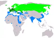 | Global range. Bright green: summer only Dark green: all year Blue: winter only | |