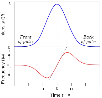نمودار (ω(t جابجایی هر قسمت از پالس را نشان میدهد. لبه جلویی به سمت فرکانسهای پایینتر (قرمزتر) و لبه عقبی به سمت فرکانسهای بالاتر (آبیتر) جابجا میشود، اما قله پالس تغییر مکان نمیدهد. برای محدوده فرکانس مرکزی (t = ±τ/۲)، یک تقریب جابجایی فرکانسی خطی توسط رابطه زیر داده میشود: