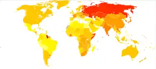 [[Image:Suicide world map - 2009 Male.svg|200px|alt=|نرخ خودکشی در هر ۱۰۰٬۰۰۰ مرد (راست) و زن (چپ) (اطلاعات از ۱۹۷۸–۲۰۰۸).