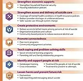 | پیشگیری | محدود کردن دسترسی به روشهای خودکشی، درمان اختلالات روانی و سوء استفاده از مواد مخدر، گزارش دادن با احتیاط رسانهها در مورد خودکشی، بهبود شرایط اجتماعی و اقتصادی[2] |