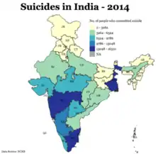 همه ساله نزدیک به ۸۰۰٬۰۰۰ تن در جهان خودکشی میکنند[2] که ۱۳۵٬۰۰۰ تن از آنان (۱۷٪) اهل کشور هند هستند؛[3] کشوری که مردمانش ۱۷٫۵٪ کل جمعیت جهان را تشکیل میدهد. از ۱۹۸۷ تا ۲۰۰۷، نرخ خودکشی در این کشور از ۷٫۹ به ۱۰٫۵ تن در هر ۱۰۰٬۰۰۰ تن افزایش یافت[4] و البته این میزان در مناطق جنوبی و شرقی هند بیشتر هم هست.[5] در سال ۲۰۱۲ تامیل نادو با ۱۲٫۵٪، ماهاراشترا با ۱۱٫۹٪ و بنگال غربی با ۱۱٫۰٪ بیشترین نرخ خودکشی در این کشور را به خود اختصاص دادند.[3] همچنین نسبت مردان به زنان در خودکشی ۲ به ۱ است.[3]
