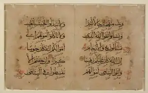 قدیمیترین نسخه قرآن به خط کوفی است و به علی بن ابیطالب منسوب است. پس از قرن پنجم هجری، خط کوفی تقریباً جای خود را به خطّ نسخ داد که حروف آن بر خلاف حروف زاویهدار خطّ کوفی منحنی و قوسدار است.[5]
