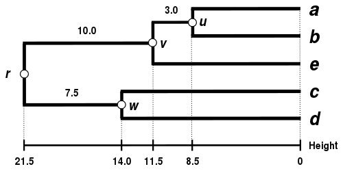 فرض کنید نشان دهنده گره ای است که به آن و وصل شدهاند. به دلیل محدودیت ultraetricity، شاخههای پیوستن یا به و به ، مساوی هستند و طول کل زیر را دارند: