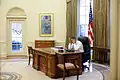باراک اوباما در دفتر بیضی کاخ سفید و تابلوی هسام بر دیوار مقابل