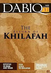 ![]() اولین شماره Dabiq نخسه زبان انگلیسی "The Return of Khilafah". | |