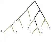 اگر به هرم مانند یک درخت دودویی نگاه کنیم، و سپس به هر گره آن (گره معادل عدد یک) و یک عدد اضافه کنیم (معادل عدد صفر) سپس شروع به خواندن سطر به سطر آن کنیم[2] (مطابق شکل زیر):