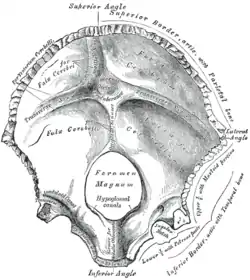 ![]() سطح داخلی استخوان پسسری. بخش مربوط به داس مخچه در چپ وسط قرار دارد. | |