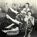 گروه نمایش «زیگفلد فولیز» در صحنهٔ تئاتر. در بالای سر و سمت چپ دالی سیسترز، دوست صمیمی آنها «آلیو توماس» هم مشاهده میشود.