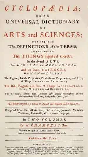 - مشارکتکنندگان ویکیپدیا. «Cyclopædia, or an Universal Dictionary of Arts and Sciences». در دانشنامهٔ ویکیپدیای انگلیسی، بازبینیشده در ۲۰ ژوئیه ۲۰۱۶.