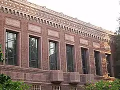 Detail showing the seven engravings over the front windows of the Knight Library, on the University of Oregon campus in Eugene, Oregon