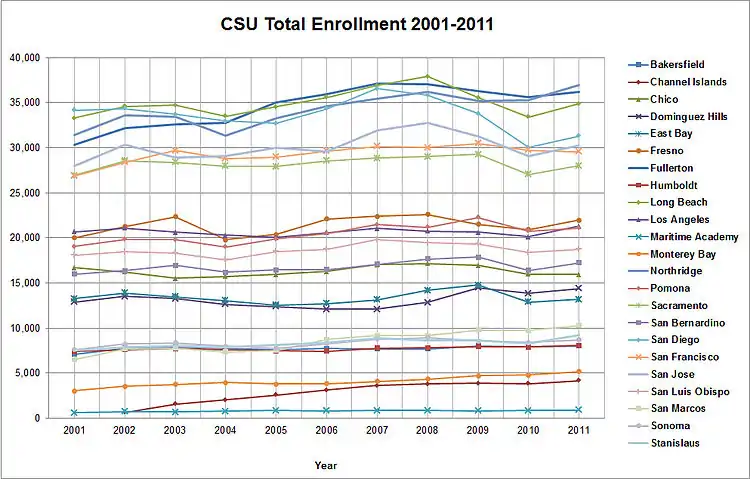 - «CSU | Public Affairs | Student Enrollment at the CSU CSU Enrollment for Fall 2000». بایگانیشده از اصلی در ۲۴ ژانویه ۲۰۰۸. دریافتشده در ۲ ژانویه ۲۰۰۸.