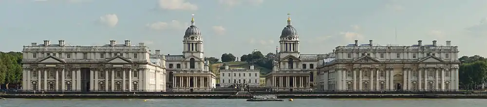 پردیس گرینویچ، این دانشگاه در مجموعهای از کالج قدیمی نیروی دریایی سلطنتی در ساحل جنوب رودخانه تیمز را در گرینویچ، لندن است. چند ساختمان مجاور این دانشگاه: دادگاه ملکه آن (جلو سمت چپ)، دادگاه کوئین مری (تماس با گنبد سمت چپ) و دادگاه پادشاه ویلیام (عقب سمت راست با گنبد).