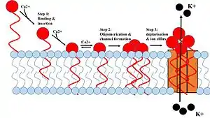 ![]() 1. Daptomycin binds and inserts into the cell membrane. 2. It aggregates in the membrane. 3. It alters the shape of the membrane to form a hole, allowing ions in and out of the cell easily. | |
