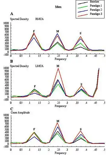 برای تحقق این هدف ، یک روش استفاده از تجزیه و تحلیل در حوزه فوریه در سری زمانی متناوب MFV بدست آمده در طی تحریکات شناختی است. در تجزیه و تحلیل فوریه پیک هایی به دست می آید که فرکانس آنها ضرایبی از فرکانس اصلی می باشد. مک دونالد در سال 1974 نشان داد که پنج هارمونیک اول معمولاً حاوی 90٪ از کل انرژی نبض در سیستم نوسانات فشار / جریان در گردش خون محیطی است. می توان تصور کرد که هر بازوی سیستم عروقی ، یک لوله ویسکوالاستیک منفرد را که توسط امپدانس خاتمه یافته است ، نشان می دهد و یک سایت بازتابی واحد ایجاد می کند. تحریک روانی ناشی از فعالیت عروق حرکتی در هر سایت ترمینال موج سینوسی ایستاده ، شامل جمع امواج برخوردی ، منعکس شده و امواج دوباره بازتاب شده از دیستال تا نقطه تقریبی اندازه گیری می باشد. مطالعات fTCDS روی یک شركت كننده در حالت خوابیده به پشت و زاویه سر در حدود 30 درجه انجام می شود. نگهدارنده پروب روی گوشها وبینی قرار می گیرد. دو پروب 2 مگاهرتز در نگهدارنده کاوشگر قرار می گیرند و برای تعیین موقعیت مناسب برای نظارت مداوم هر دو ساقه اصلی MCA در عمق 50 میلی متر از سطح کاوش انجام می شود. ضبط سری زمانی MFV برای هر محرک به دست می آید و دومی برای آنالیز فوریه استفاده می شود.الگوریتم تبدیل فوریه از نرم افزار استاندارد استفاده می کند (برای مثال ، سری زمانی و ماژول پیش بینی ، STATISTICA ، StatSoft ، Inc.). کارآمدترین الگوریتم استاندارد فوریه ایجاب می کند که طول سری ورودی برابر با توان 2 باشد. درصورتی که اینگونه نباشد ، باید محاسبات اضافی انجام شود. برای به دست آوردن سری زمانی مورد نیاز ، داده ها در بخش های 10 ثانیه ای به مدت 1 دقیقه یا هر محرک به طور متوسط ، 6 نقطه داده برای هر شرکت کننده و در مجموع 48 نقطه داده برای هر هشت زن و مرد به دست می آید. هموار سازی مقادیر پریودوگرام با استفاده از یک تبدیل میانگین متحرک وزنی انجام می شود. پنجره Hamming برای هموار کردن سیگنال استفاده می شود. برآورد چگالی طیفی ، حاصل از تجزیه و تحلیل سری فوریه رسم می گردد و نواحی فرکانسی با بیشترین برآورد بصورت پیک هایی مشخص می شود. منشأ قله ها به منظور تعیین قابلیت اطمینان تکنیک حاضر مورد توجه هستند. قله های بنیادی (F) ، قشر مغز (C) یا حافظه (M) و زیر قشر (S) به ترتیب در فواصل مرتب فرکانس 0.125 ، 0.25 و 375/0 به ترتیب رخ می دهند. با فرض اینکه فرکانس اساسی نوسانات قلبی ، متوسط ضربان قلب باشد ، این فرکانسها را می توان به هرتز تبدیل کرد. فراوانی اساسی (F) هارمونیک اول را می توان از میانگین ضربان قلب در ثانیه تعیین کرد. به عنوان مثال ، ضربان قلب 74 بار در دقیقه ، 74 چرخه در 60 یا 1.23 هرتز را پیشنهاد می کند. به عبارت دیگر ، قله های F- ، C- و S به ترتیب در مضارب هارمونیک اول ، در هارمونیک های دوم و سوم رخ داده اند. فاصله سایت بازتاب برای پیک F ممکن است به نظر برسد که از یک سایت در D1 = طول موج / 4 = cf / 4 = 6.15 (m / s) / (4/1 × 1.23 هرتز) = 125 سانتی متر سرچشمه می گیرد. فرضیه سرعت انتشار موج درخت شریانی محیطی مطابق مک دونالد ، 1974.پیک C در هارمونیک دوم اتفاق افتاد ، به طوری که طول برآورد شده شریانی (با استفاده از کاروتید مشترک C = 5.5 متر بر ثانیه) توسط D2 = طول موج / 8 = cf2 / 8 = 28 سانتی متر و فرکانس f 2.46 هرتز داده شد . فاصله تقریبی طول شریانی قابل مشاهده از ساقه اصلی MCA ، از طریق احتقان عروق و اطراف محدب مغزی ، تا رگهای انتهایی در محلهای قشر دیستال مانند اتصالی اوپیتیتو موقتی روی آنژیوگرام کاروتید بزرگسالان را نشان می دهد.پیک S در هارمونیک سوم رخ داده است ، و ممکن است از یک محل تخمین زده شده در D3 = طول موج / 16 = cf3 / 16 = 3.3 سانتی متر و فرکانس f3 از 3.69 هرتز بوجود آمده باشد. دومی طول شریانی قابل مشاهده عروق عدس را از ساقه اصلی MCA در آنژیوگرام کاروتید تقریب می دهد. اگرچه نمایش داده نمی شود ، انتظار می رود که هارمونیک چهارم از نزدیکی MCA در نزدیکی به محل اندازه گیری در ساقه اصلی MCA ناشی شود. طول پیش کوک شدن از نقطه اندازه گیری توسط D4 = طول موج / 32 = cf4 / 32 = 3.5 سانت