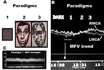 عملکرد سونوگرافی ترانس کرانیال داپلر (fTCD) یک ابزار عصبی برای اندازه گیری سرعت جریان خون مغزی به دلیل فعال شدن عصبی در حین انجام کارهای شناختی است.[8] TCD عملکردی از فناوری داپلر برای ثبت سرعت جریان خون در شریان مغزی قدامی ، میانی و خلفی استفاده می کند. شبیه به سایر تکنیک های تصویربرداری عصبی مانند تصویربرداری رزونانس مغناطیسی عملکردی (fMRI) و توموگرافی انتشار پوزیترون PET) ، fTCD) بر اساس یک اتصال نزدیک بین تغییرات جریان خون مغزی منطقه ای و فعال سازی عصبی است. به دلیل نظارت مداوم بر سرعت جریان خون ، TCD وضوح زمانی بهتری نسبت به fMRI و PET ارائه می دهد. این روش غیر تهاجمی است و کاربرد آن آسان است. اندازه گیری سرعت جریان خون در برابر تداخل های حرکتی مقاوم است. از زمان معرفی این تکنیک ، به طور قابل ملاحظه ای در توضیح سازمان نیمکره عملکردهای شناختی ، حرکتی و حسی در بزرگسالان و کودکان نقش داشته است.[9][10] fTCD برای بررسی جانبداری مغزی عملکردهای اصلی مغز مانند زبان ، [11][12][13] پردازش صورت ، [14] پردازش رنگ ، [15] و هوش استفاده شده است.[16] علاوه بر این ، بیشتر بسترهای عصبی برای عملکرد مغز توسط شریانهای اصلی مغزی که مستقیماً می توانند مسموم شوند ، پرفیوژن می شوند. سرانجام ، fTCD به عنوان یک رابط کاربری مغز و کامپیوتر مورد استفاده قرار گرفته است.[17]