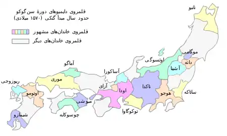 * خاندان تاکدا (武田)، دایمیوی منطقهای که با رنگ بنفش مشخص شده و و امروزه استان یاماناشی در آن واقع شده است.