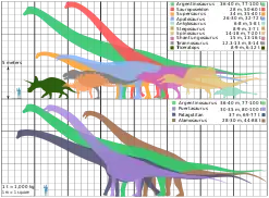 ردیف پایین؛ بزرگترین گیاهخواران: آرژانتیناسور (سبز)، پاتاگوتایتان (سرمهای)، پورتاسور (بنفش) آلاموسور (قهوهای)