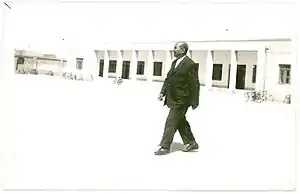 دبيرستان پسرانه ايرانشهر كرمان. ميرزا برزو آميغي مدير دهه ۱۳۲۰ آن در ميانه دبيرستان در حال راه رفتن است.
