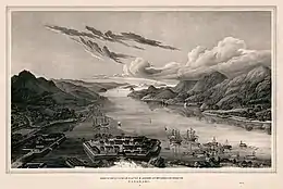 تصویری نقاشی شده از جزیره دجیما در سواحل ناگازاکی در ۱۸۹۷ میلادی