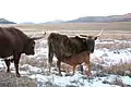 گوساله درازشاخ در حال شیرخوردن از مادر