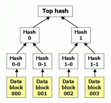 یک درخت درهمسازی درختی است که برگهای آن درهمسازی شدهٔ بلوکهای داده (مثلاً یک فایل یا مجموعهای از فایلها) است. هر گره پدر، در همسازی شدهٔ گرههای فرزند خودش است. این روش بر خلاف دیگر روشهای معمول درختها، از پایین به بالا کار میکند؛ یعنی ورودی آن برگها هستند و نه ریشه. به عنوان مثل، در شکل روبرو، ۰ حاصل در همسازی ۰–۰ و ۱–۰ است؛ که با الحاق ۰–۰ و ۱–۰ به دست میآید. اکثر پیادهسازیهای انجام شده برای درختهای درهم سازی، دودویی هستند. اما میتوان، با توجه به روش مورد استفاده و همچنین نیاز، فرزندان بیشتری را نیز متصور بود. معمولاً یک تابع درهمسازی رمزی[7] مثل: SHA-1، Whirpool, Tiger و… برای درهمسازی مورد استفاده قرار میگیرد. اگر قرار باشد که درختهای درهمسازی فقط در برابر صدمات غیرعمدی محافظت شوند؛ میتوان از روشهایی که امنیت کمتری دارند ولی در عوض سادهتر هستند مثل CRC استفاده کرد. در بالای درخت درهم سازی؛ Top Hash[8] قرار دارد. پیش از دانلود کردن یک فایل از شبکههای نظیر به نظیر، در اکثر موارد، Top Hash از یک منبع مورد اطمینان مثل رایانهٔ یک دوست یا حتی سایتهایی که در این زمینه شهرت دارند، دریافت میشود. اگر توانستیم بدین وسیله Top Hash را به دست آوریم، ما بقی درخت درهمسازی را میتوان از هر منبع دیگری دریافت کرد. در نهایت، درخت درهم سازیِ دریافت شده را میتوان به وسیلهٔ Top Hash مطمئنی که قبلاً دریافت کردهایم، بررسی کرد. اگر قسمتی از درخت درهم سازی، صدمه دیده یا جعلی باشد، آن قسمت از درخت از منبع دیگری امتحان میشود تا در نهایت، برنامه Top Hash درست و مطابق با Top Hash اولیه را بیابد. تفاوت عمدهای که بین درختهای درهمسازی و فهرستهای درهمسازی وجود دارد این است که در درختهای درهم سازی، یک شاخه از درخت را میتوان یکجا دانلود کرد و یکپارچگی آن را بلافاصله بررسی کرد؛ حتی اگر تمام درخت بهطور کامل در دسترس نباشد. این یک ویژگی خوب برای درختهای درهمسازی است چرا که تکه کردن فابلها به بلوکهای کوچکتر، به صرفه است؛ زیرا اگر آنها صدمه ببینند، فقط قطعهای از دادهها باید دوباره دانلود شود و نیازی به دانلود تمام فایل نیست.