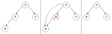 فرض کنید گرهای که میخواهیم حذف کنیم گرهٔ A باشد. اگر گره بدون فرزند باشد (گرۀ خارجی)، آنگاه فرزند والدین گرهٔ A تهی میشود. اگر دارای یک فرزند باشد، آنگاه فرزند A را به والدین گرهٔ A متصل میکنیم در نتیجه والدین فرزند A والدین گرهٔ A میشود.