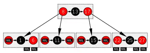 یک درخت قرمز-سیاه ار نظر ساختار شبیه یک درخت بی مرتبه ۴ است که در آن هر گره میتواند ۱ تا ۳ مقدار و همچنین ۲ تا ۴ اشاره گر به فرزندانش داشته باشد. در هر درخت بی، هر گره تنها یک مقدار دارد که برابر مقدار گره سیاه در درخت قرمز-سیاه است، و یک مقدار دلخواه دارد که و/یا بعد از آن در همان گره آمدهاست، که هر دوی آنها مساوی گره قرمز در درخت قرمز-سیاه هستند. یک راه دیدن این برابری این است که در گرههای قرمز درخت قرمز-سیاه در یک نمایش گرافیکی به سمت بالا حرکت کنیم، بهطوریکه با پدر سیاهشان در یک ردیف قرار بگیرند و یک دسته افقی را تشکیل دهند. در درخت بی، یا در نمایش گرافیکی تغییر یافته درخت قرمز-سیاه که گفته شد، همه برگها عمق یکسانی دارند. در این حالت درخت قرمز-سیاه، از نظر ساختار با درخت بی مرتبه ۴ برابر است که حداقل میزان پرشدن در یک دسته برابر ۳۳٪ است. این نوع درخت بی، عمومی تر از درخت قرمز-سیاه است اما هنگام تبدیل به درخت قرمز-سیاه، ابهاماتی دارد چون از یک درخت بی مرتبه ۴، چندین درخت قرمز-سیاه ساخته میشود. اگر یک دسته در درخت بی تنها ۱ مقدار را شامل شود، این مقدار کمینه است، گره مربوطه سیاه است و دو اشاره گر به فرزندانش دارد. اگر یک دسته شامل ۳ مقدار شود، مقدار وسطی در یک گره سیاه قرار میگیرد و گرههای کناری آن باید قرمز باشند. اگر دسته شامل ۲ مقدار باشد، هر کدام از آنها میتواند در درخت قرمز-سیاه، سیاه باشد و دیگری باید قرمز باشد؛ بنابراین درخت بی مرتبه ۴، مشخص نمیکند که کدامیک از مقادیر در هر دسته ریشه سیاه کل آن دسته و پدر بقیه مقادیر دسته است. با وجود این، عملیات در درختهای قرمز-سیاه از نظر زمان بهینه تر هستند چون نیازی به نگهداشتن برداری از مقادیر نیست. این نگهداری زمانی که مقادیر مستقیماً در هر گره ذخیره شدهاند، نسبت به وقتی که تنها مرجع آنها نگهداری شدهاست، پر هزینه است. البته گرههای درخت بی از نظر حافظه به صرفه تر هستند چون لازم نیست برای آنها صفت رنگ نگهداری شود. در عوض باید مشخص شود کدام بخش از دسته استفاده شدهاست. میتوان شباهتهایی با درختهای بی مرتبههای بالاتری که از نظر ساختار شبیه درخت دودویی رنگ شده باشند هم ایجاد کرد چون تنها به رنگهای بیشتری نیاز است. مثلاً فرض کنید آبی را هم استفاده کنیم. در نتیجه درخت آبی-قرمز-سیاه مثل درخت قرمز-سیاه تعریف میشود اما با این محدودیت اضافه که دو گره متوالی از نظر مقدار نباید آبی باشند و همه گرههای آبی باید فرزندان گره قرمز باشند. چنین درختی معادل یک درخت بی میشود که دستههای آن حداکثر ۷ مقدار و با این رنگها دارند :آبی، قرمز، آبی، سیاه، آبی، قرمز، آبی (هر گروه حداکثر ۱ گره سیاه، ۲ گره قرمز و ۴ گره آبی دارد). برای تعدیل کردن حجم مقادیر، درج و حذف در یک درخت دودویی سریعتر از درختهای بی است چون درختهای رنگ شده تلاشی برای بیشینه کردن مقدار پر شدن در یک دسته افقی از گرهها نمیکنند. (تنها کمینه مقدار پرشدن در درختهای دودویی رنگ شده تضمین شدهاست). چرخش در درختهای بی سریع تر است (چون چرخشها اغلب در دسته یکسان رخ میدهند به جای اینکه در چند گره مجزا در یک درخت دودویی رنگ شده انجام شوند). با این وجود برای مرتبسازی حجم زیادی از دادهها، درختهای بی بسیار سریعتر هستند چون با گروهی کردن چند فرزند در یک دسته و امکان دسترسی محلی، فشرده تر شدهاند. همه بهینهسازیهای ممکن در درختهای بی برای افزایش متوسط میزان پرشدن گروهها در درختهای دودویی رنگ شده هم ممکن است. بیشینه کردن میزان پرشدن در یک درخت بی، مانند کم کردن ارتفاع درخت چند رنگ است که با افزایش تعداد گرههای غیر سیاه انجام میشود. بدترین حالت زمانی رخ میدهد که همه گرهها در یک درخت دودویی رنگ شده، سیاه باشند. بهترین حالت زمانی است که تنها یک سوم آنها سیاه باشند (و دو سوم بقیه، قرمز باشند).