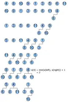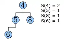 مقدار s یک گره فاصله آن گره تا نزدیکترین برگ در نمایش درخت دودویی گسترش یافتهاست. در شکل، نمایش گسترش یافته (نشان داده نشده) درخت را پر میکند تا یک درخت دودویی کامل بسازد (اضافه کردن پنج برگ)، کمینه فاصله تا برگها نیز در شکل مشخص شدهاست. بنابراین مقدارs راس 4 برابر 2 است زیرا نزدیکترین برگ راس 8 میباشد (اگر 8 توسیع شده باشد). مقدار s راس 5 برابر 1 است زیرا در نمایش گسترش یافته آن خودش یک برگ خواهد داشت.