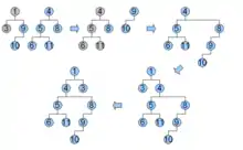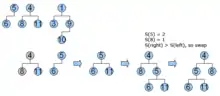 در بخش دوم، ادغام کمی پیچیده تر صورت میگیرد. درخت با ارزش کمتر (درخت x) یک فرزند راست دارد، بنابراین ادغام دوباره باید روی زیردرختی که ریشه اش فرزند راست درخت x و درخت دیگر است فراخوانی شود. بعد از ادغام با زیردرخت در نهایت درخت حاصل در درخت x جایگزاری میشود. حال مقدار s فرزند راست (s=2) بزرگتر از مقدارs فرزند چپ (s=1) است، پس باید با هم جابجا شوند. حال مقدار s ریشه گره چهارم برابر 2 است.