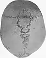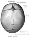 ![]() دید جمجمه انسان از بالا و درز سهمی به رنگ قرمز. | |