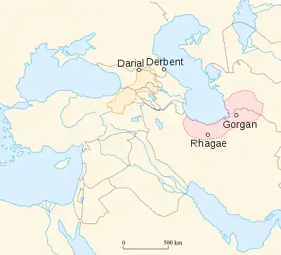 نام «دروازههای کاسپین»[یادداشت 3] در اصل به ناحیه باریکی در گوشه جنوب شرقی دریای خزر اطلاق میشد، که در واقع اسکندر از میان آن در تعقیب اردشیر چهارم پیش روی کرد، اگرچه وی برای مستحکم کردن و سنگربندی آن توقف نکرد. این ناحیه توسط تاریخنگاران خیالپردازتر اسکندر به گذرگاههای میان قفقاز منتقل شد.