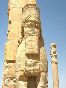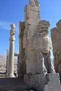 یکی از ابوالهولها با بال برافراشته به همراه سنگ نبشته بالای آن و یکی از سرستونهای کاخ.