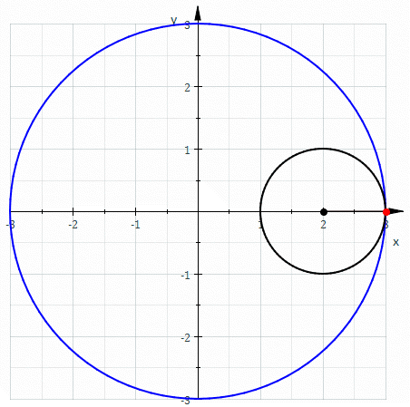 خم قرمزرنگ، یک درونچرخزاد است که با چرخش دایرهٔ کوچک سیاهرنگ در درون محیط دایرهٔ بزرگ آبیرنگ پدید میآید. (پارامترهای آن عبارتند از: R = 3, r = 1,).