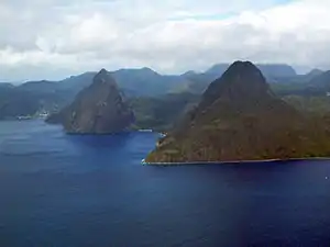 دید هوایی از درپوشهای آتشفشانی پیتونز در سنت لوسیا در دریای کارائیب.