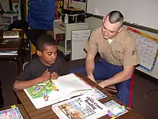 سرباز نیروی دریایی آمریکا به کودک یاری میرساند تا مهارت درک مطلب خود را بهبود بخشد