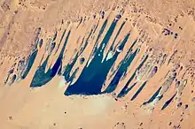 چشمانداز فضانوردان در سال ۲۰۰۹ از اوونیانگا سریر. تصویر تقریباً ۱۱ در ۹ کیلومتر (۷ در ۶ مایل) پوشش میدهد سطح تاریک آب توسط تپههای ماسه ای خطی و نارنجی تقسیم میشود.[1]