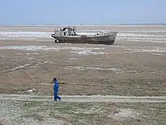 ![]() یک کشتی بهگل نشسته در دریاچهٔ آرال سابق، نزدیکی بندر سابق آرال در قزاقستان، ۲۰۰۳ | |
