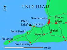 دریاچه قیر در نزدیکی شهرک لابرئا در استان سیپاریا در جنوب غرب جزیره ترینیداد واقع شدهاست. این دریاچه محدودهای حدود ۱۰۰ جریب فرنگی را میپوشاند و ژرفای آن ۲۵۰ پا گزارش شدهاست.