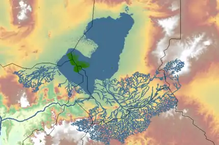 در بزرگترین شکل آن دریاچه کهن، رودخانه مایو کبی خروجی آن را تشکیل میداد و آب دریاچه را به رودخانه نیجر و سپس اقیانوس اطلس میریخت.[1]