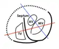 ![]() Anterior (frontal) view of the opened heart. White arrows indicate normal blood flow. (Tricuspid valve labeled at bottom left.) | |