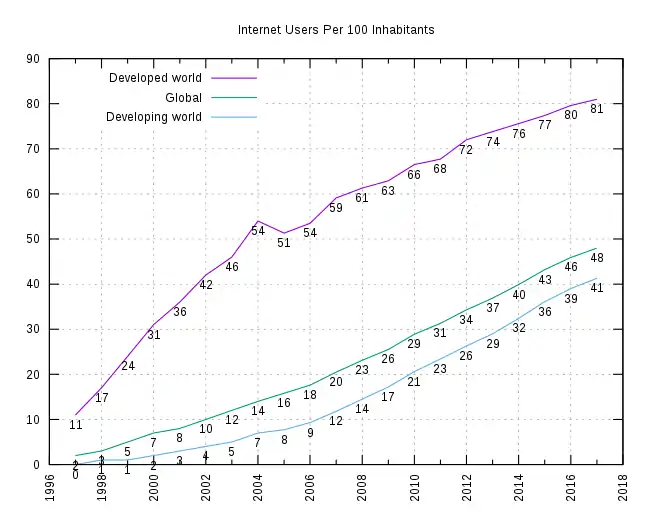 طبق آمارهایی که در ژوئن ۲۰۱۸ به دست آمده، ۵۵/۵٪ از جمعیت جهان به اینترنت دسترسی دارند.[1] در سال ۲۰۱۵ اتحادیه بینالمللی مخابرات تخمین زد که تا پایان این سال تقریباً ۳٫۲ بیلیون نفر به اینترنت دسترسی خواهند داشت. از این تعداد ۲ بیلیون کاربر از کشورهای درحال توسعه خواند بود که ۸۹ میلیون نفر آنها از کشورهای توسعهنیافته هستند.[2][3]