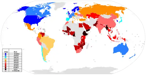 ![]() ثابت پهنای باند اینترنت اشتراک در ۲۰۱۲ منبع: بینالمللی اتحادیه ارتباطات راه دور.[13]براساس جمعیت کشورها |