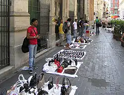 دستفروشانی که در رم، ایتالیا، کیف و عینک آفتابی میفروشند.