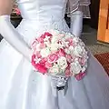 یک عروس دسته گلی را در دست گرفته است، که شامل گلهایی با ساقهٔ دراز و گلهای وحشی است.