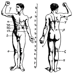 تصویر راست: β = زنخدان برروی ستون مهرهها بالا و پشت استخوان تهیگاهی γ = گوشه پایین کتف δ = سر بیرونی ماهیچه سهسر بازویی ε = فرورفتگی great trochanter ζ = فضای رَکَبی (زانویی) η = ماهیچه دوقلو. | |