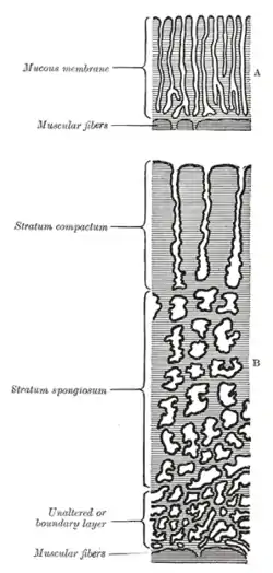 ![]() طرحی از مقاطع غشاء مخاط رحم. A) رحم غیر-حامله. B) دسیدوای جداری؛ غشای مخاطی در رحم حامله که زیر جفت وجود ندارد. | |
