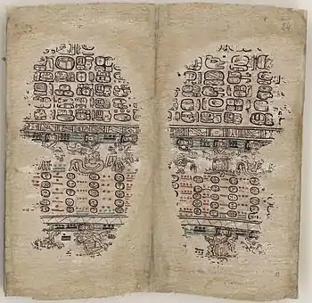 ![]() The final two pages of the Paris Codex, showing the Maya "zodiac" | |