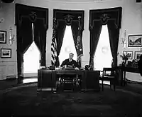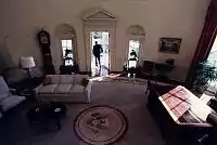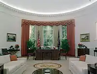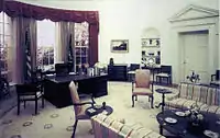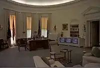![]() دفتر بیضی در هنگام ترور جان اف. کندی در حال تغییر دکور به شکل زیر بود. کندی هیچوقت نتوانست از دفترش بااین دکور استفاده کند. |