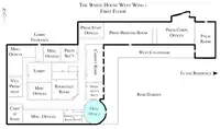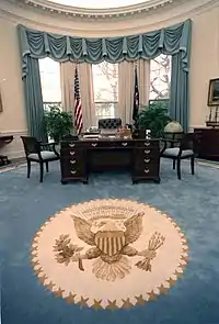 ![]() ریگان دراوایل ریاست جمهوری اش از فرش زیر استفاده می کرد، اما بعد از یک سال آن را با فرش طراحی شده توسط نانسی ریگان عوض کرد. |