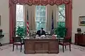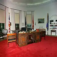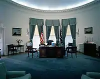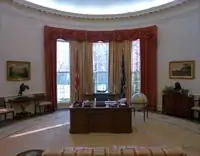 ![]() شبیه سازی دفتر بیضی نیکسون در موزه و کتابخانه ریاست جمهوری ریچارد نیکسون |